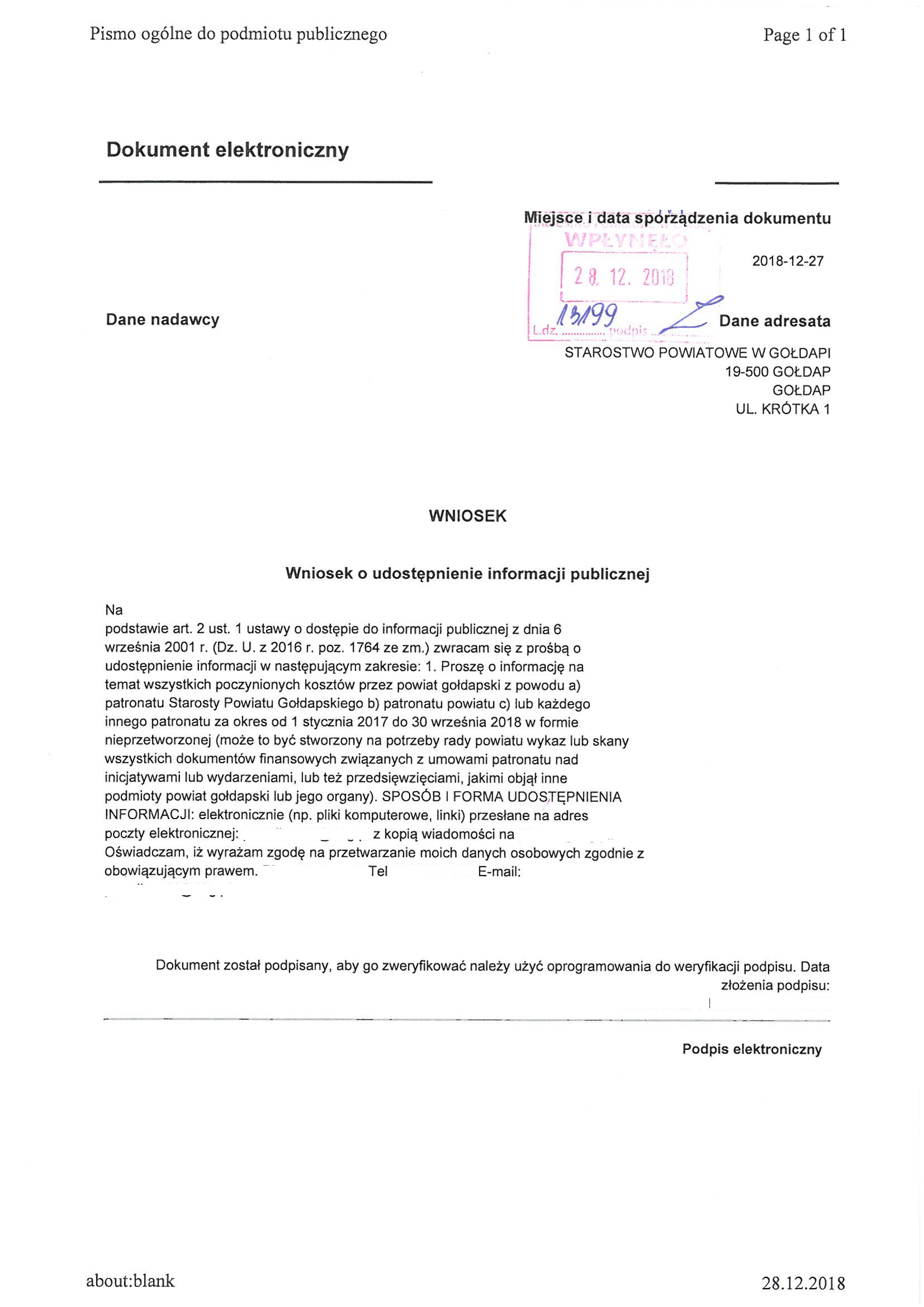 Informacja na temat wszystkich poczynionych kosztów przez powiat goldapski z powodu patronatu starosty gołdapskiego